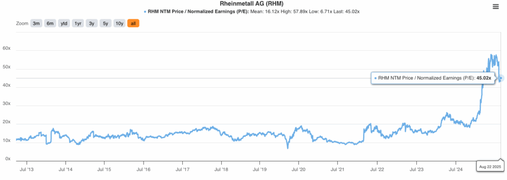 Besonders kritisch wird die Bewertung gesehen. Auf Sicht der kommenden zwölf Monate wird für Rheinmetall ein Kurs-Gewinn-Verhältnis von über 45 erwartet – deutlich mehr als der Zehnjahresdurchschnitt von 18. Analysten erwarten zwar ein starkes Gewinnwachstum, doch es bewegt sich gerade so im Einklang mit der Bewertung. In der Praxis heißt das: Die Erwartungen sind extrem hoch und lassen kaum Raum für Enttäuschungen. Die Börse ist hier gnadenlos – schon kleine Abweichungen von den Prognosen können kräftige Kursrückgänge auslösen.