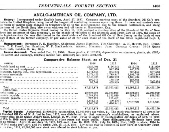 Manchmal erzählt ein altes Börsenhandbuch mehr über die Dynamik der Märkte als jede aktuelle Chartanalyse. Im Moody’s Analyses of Investments von 1918 findet sich das Profil der Anglo-American Oil Company, Ltd. – damals noch ein wichtiger Arm des Standard-Oil-Imperiums in Europa.