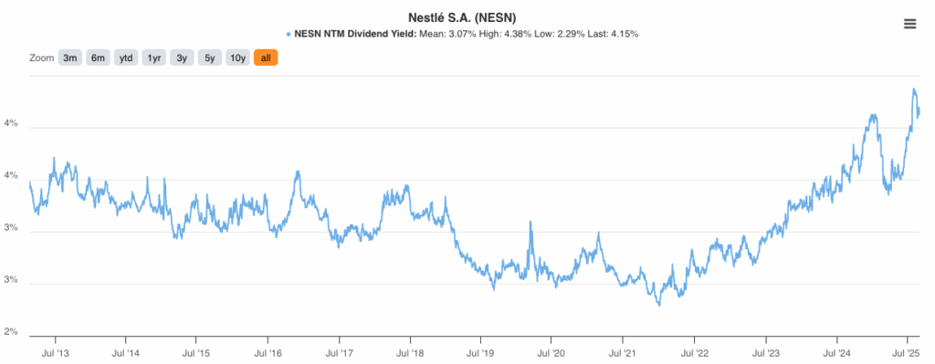 Während die Aktie unter Druck steht, hat sich die Dividendenrendite spürbar erhöht: von rund 2,4 % vor drei Jahren auf inzwischen 4,2 %. Damit bietet Nestlé heute eine Ausschüttung, die weit über den 0,36 % der zehnjährigen Schweizer Staatsanleihen liegt. Für Anleger ist das ein wichtiges Signal: Selbst wenn das Kurswachstum stockt, bleibt Nestlé ein verlässlicher Dividendenzahler – ein Argument, das gerade in unsicheren Zeiten Stabilität ins Depot bringen kann.